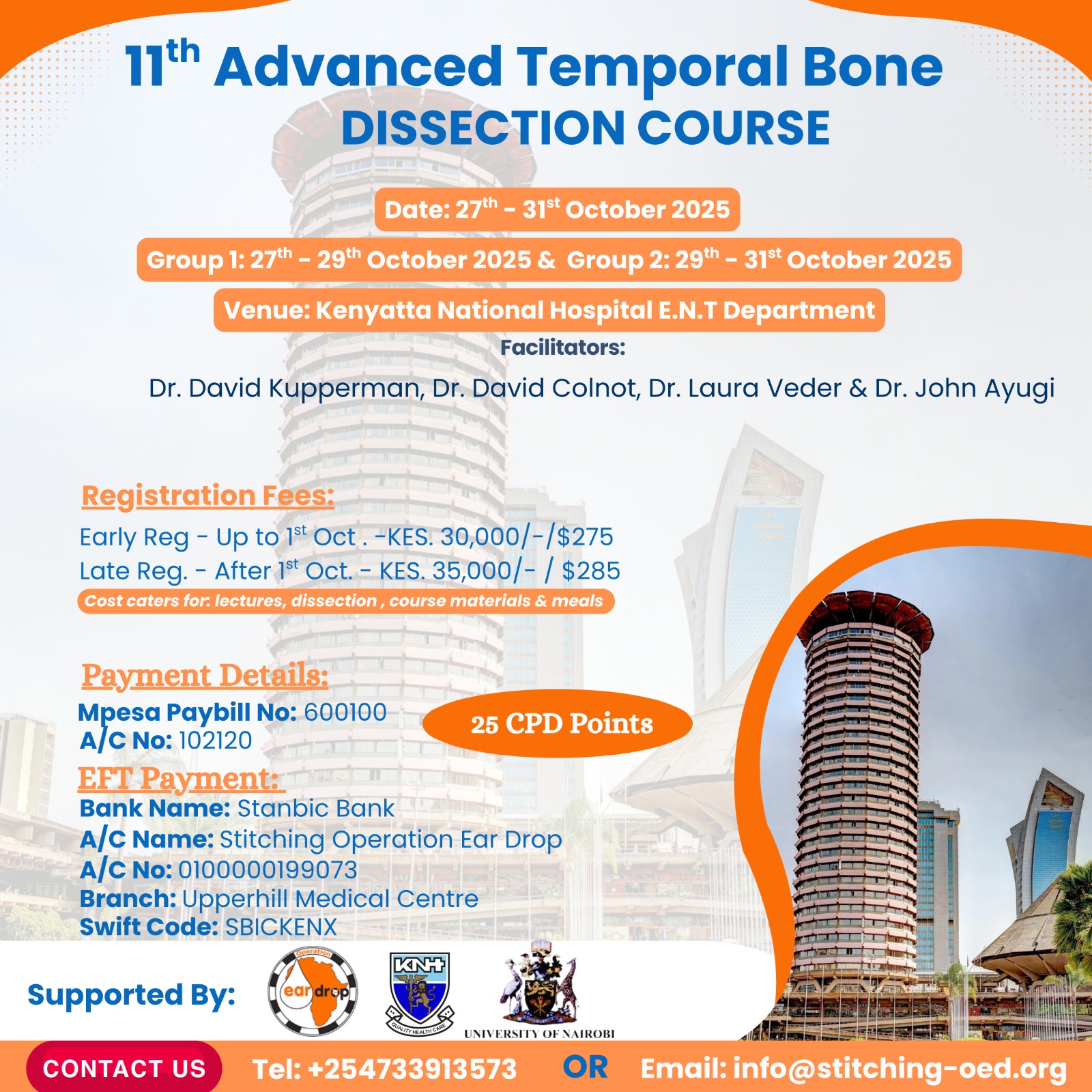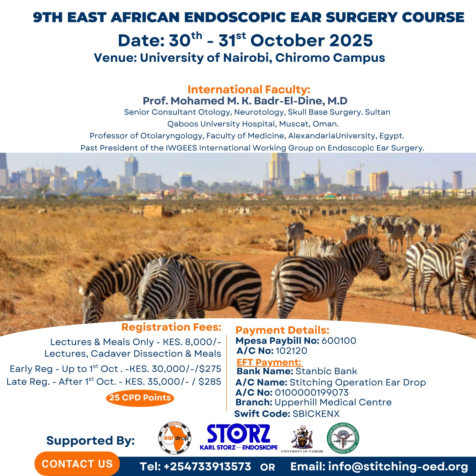 On behalf of the organizing committee, I invite you to the Date 30th – 31st st East African Endoscopic Ear Surgery Course 2025 which is jointly organized by Operation Ear Drop Kenya and University of Nairobi.
